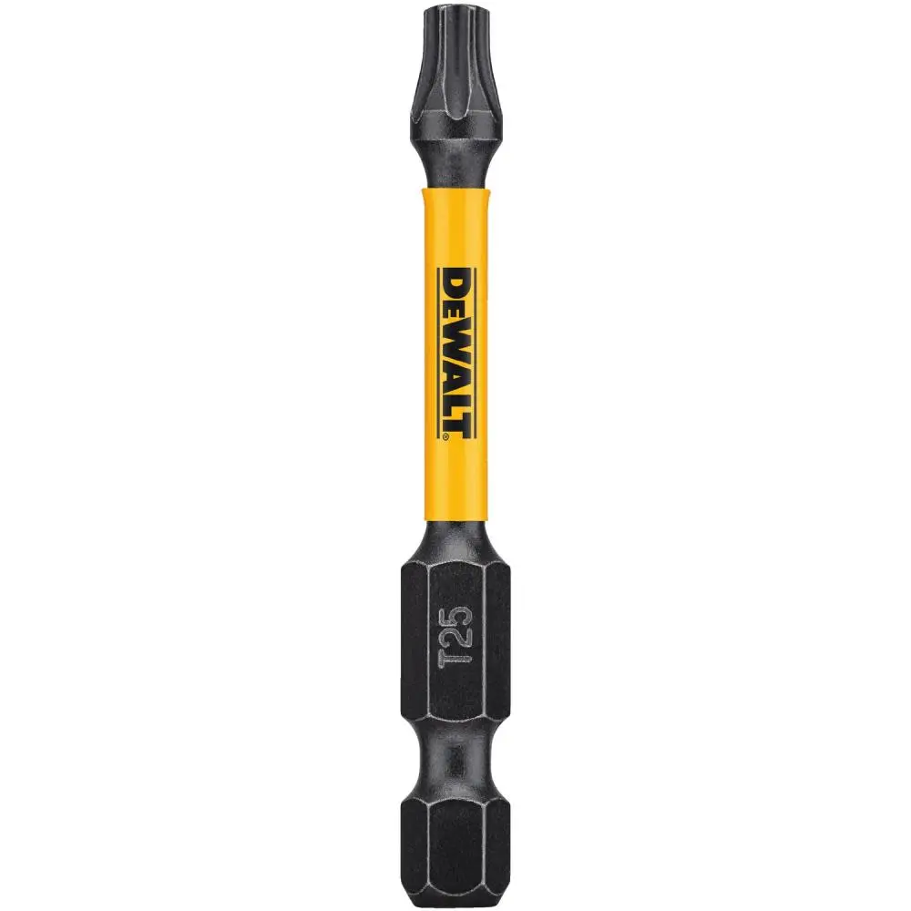 A pack of 2 DEWALT FlexTorq 2-in TX25 Impact Ready bits, made out of shock resistant tool steel. The advanced hardening process produces maximum durability. These bits can be used in bit tip holders for driving screws into a variety of materials.