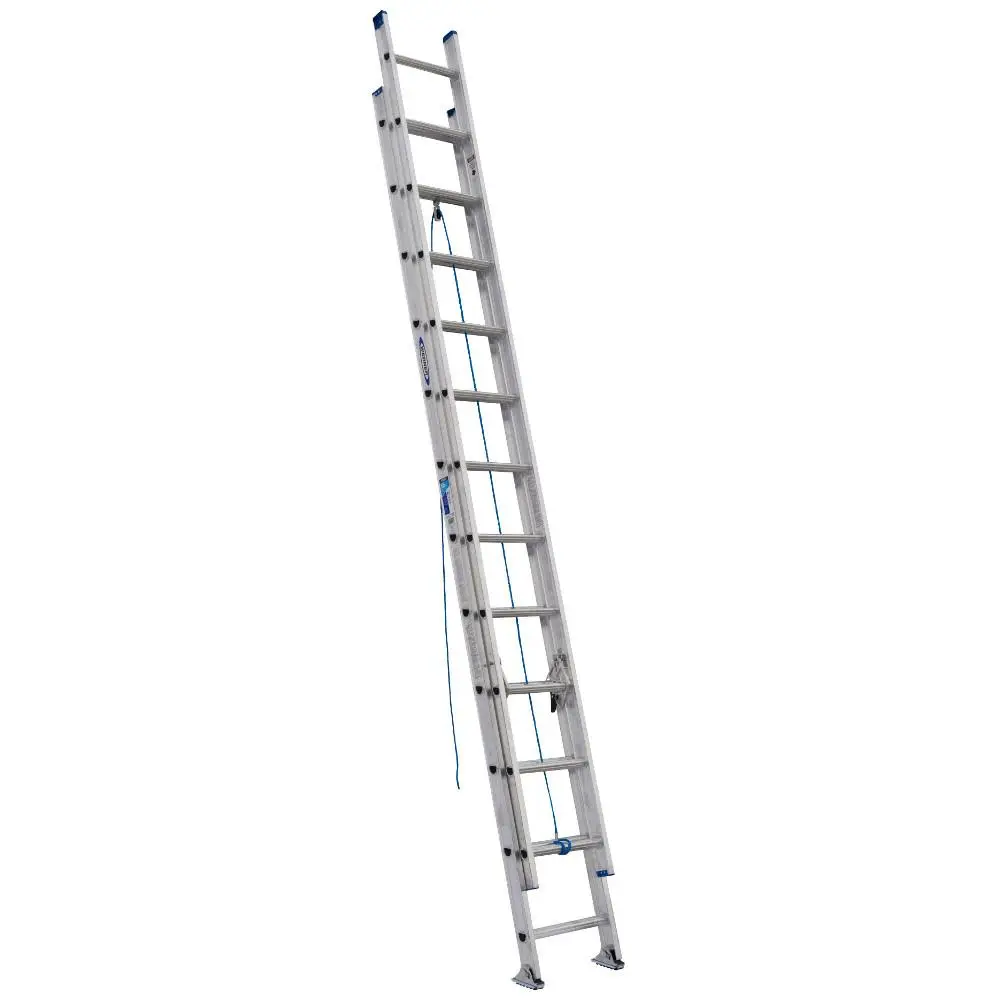 The Werner® 24-Foot Type-I Aluminum D-Rung Extension Ladder is perfect for just about any job or project. With a 250-pound duty rating and modified heavy-duty rails, it can support your tools and supplies. The slip-resistant Traction-Tred® rungs and the Twist-Proof® performance provided by the ALFLO® rung joint make this heavy-duty extension ladder safe and stable. The shoes can either be held flat or in spur position with its Shu-Lok® technology. The Werner extension ladder minimizes damage to surfaces it is used on thanks to its mar-resistant end caps. It has extruded heavy-duty rung locks that are spring loaded for ease of use. It’s also weather-resistant and meets ANSI and OSHA standards.